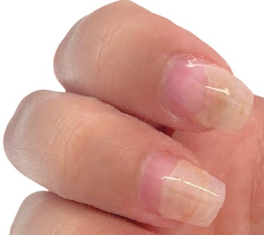Nach dem Entfernen des Shelacks nach 4 Wochen stellte ich fest, dass sich der Nagel vom Nagelbett gelöst hatte und sich darunter ein Hohlraum befand.